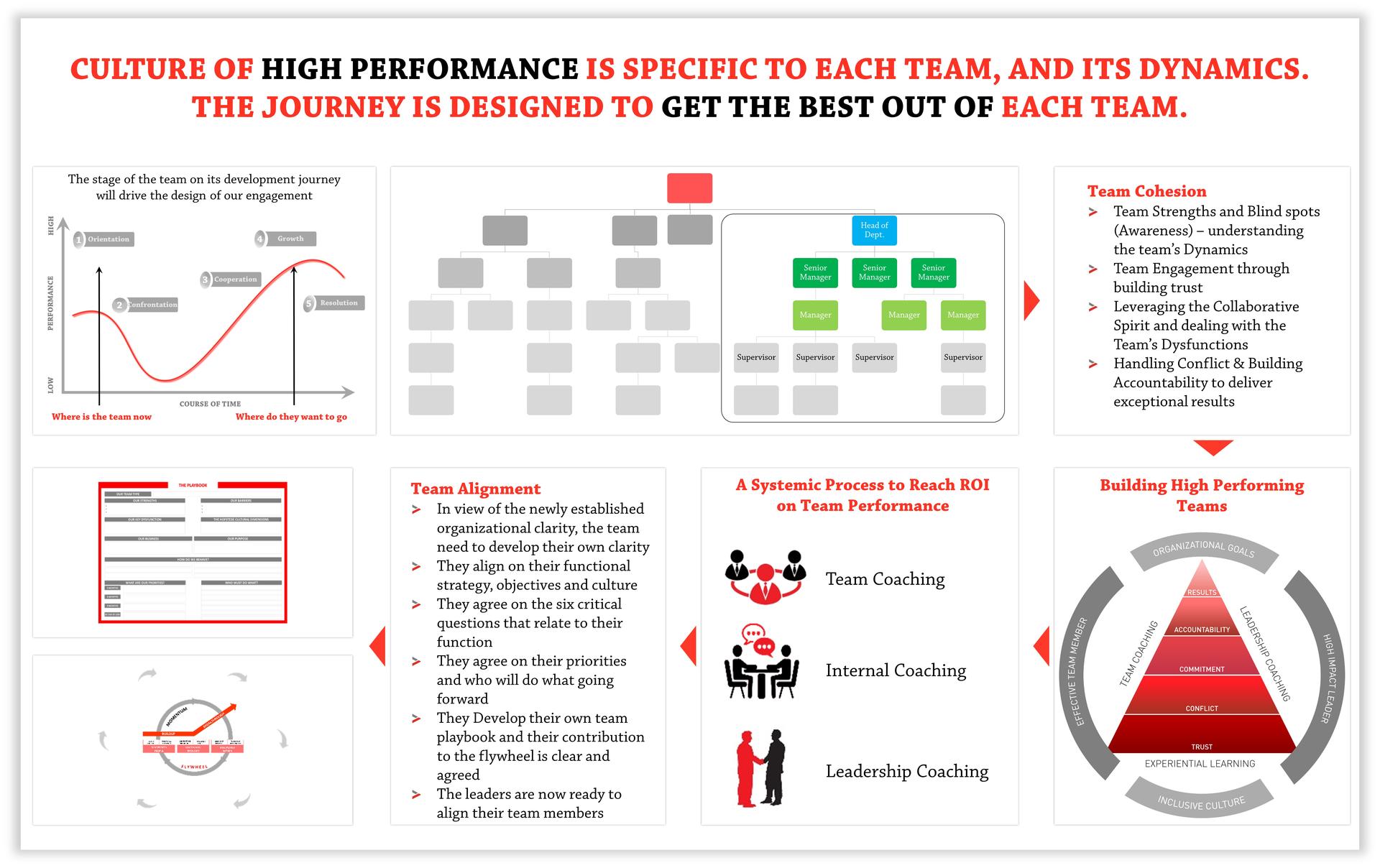 Building an agile high performing team is a progressive process that requires several interventions and utilizes various tools. We employ several components to make the team journey effective and impactful in reaching the desired performance.