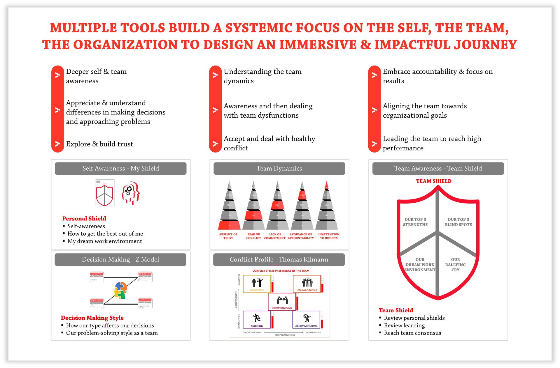 In our quest to build an agile high performing team that excels in today's dynamic business landscape, we recognize the importance of employing various tools and strategies. These tools help us create an immersive and impactful journey. Here are some of the key tools and approaches we use to drive excellence across these three components: